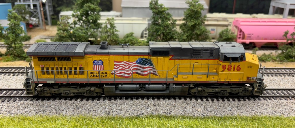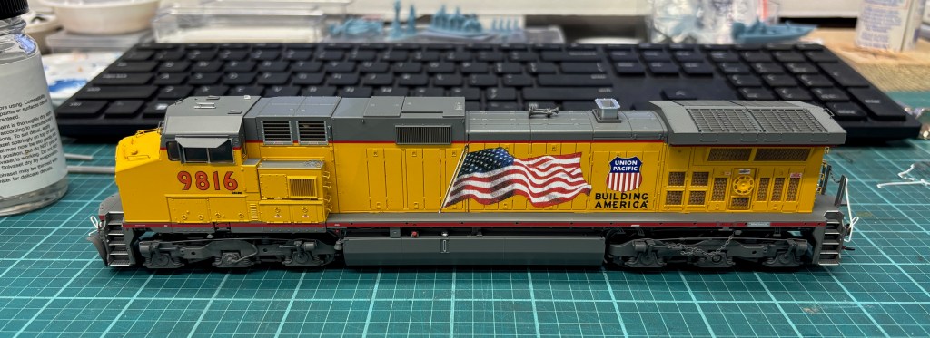 The latest projects I just finished included converting an Athearn Genesis C44-9W to a paint scheme that was applied early in the development of UP’s modern Flag Scheme seen on thier engines today. The engine features the standard flag, but also includes a large UP Shield and Building America on the long hood behind the Flag. The nose also sports the UP wings and the lightening striping on the long hood. To date, I’ve only been able to find photo’s online for one C44-9W that had this paint scheme – #9816.