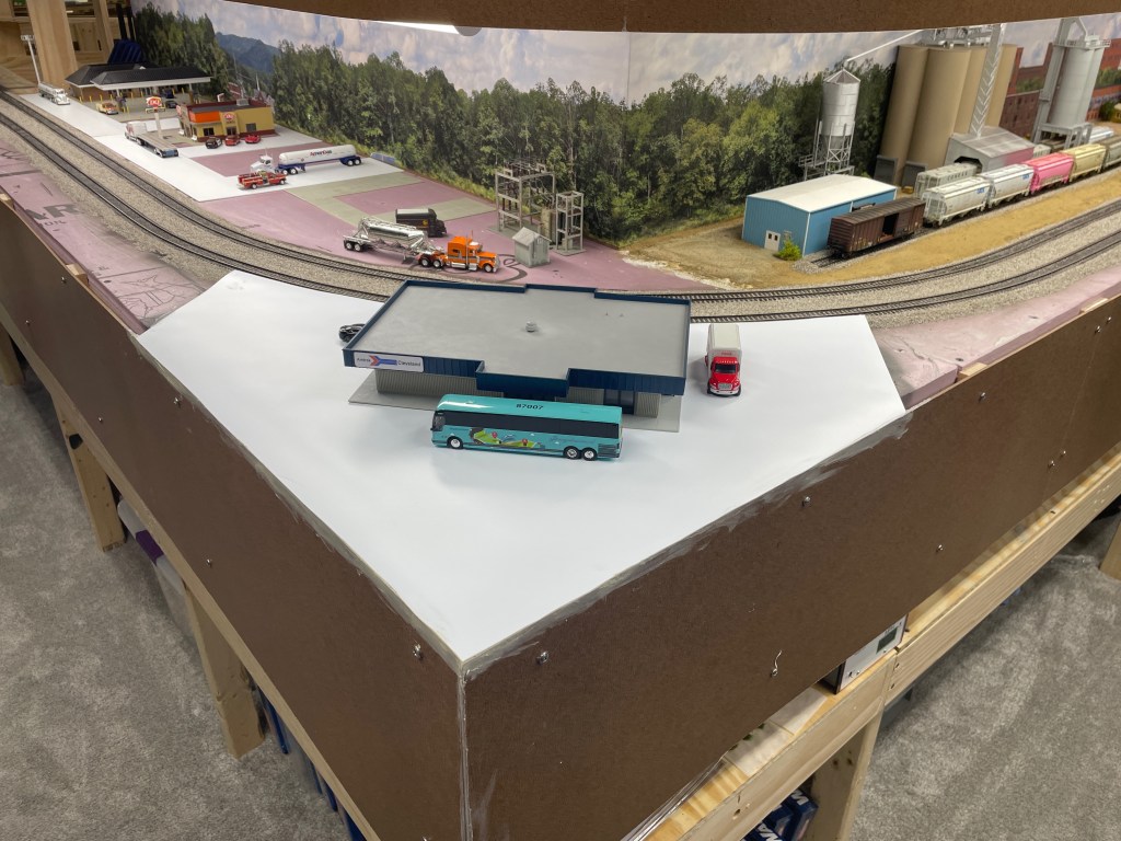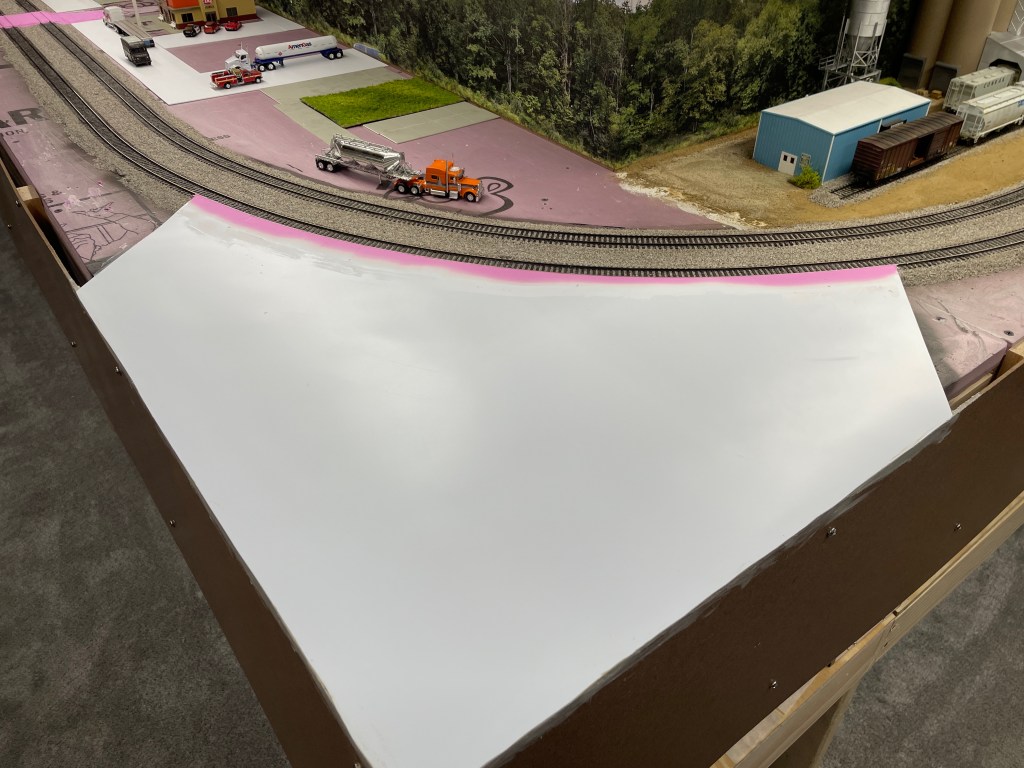 First step was to prep the pavement and foundation for the building and parking lot. I simply cut a piece of .030″ styrene sheet to fit the curve. I used standard drywall putty to fill in the small gaps between the rails and the styrene (pink stuff seen below).