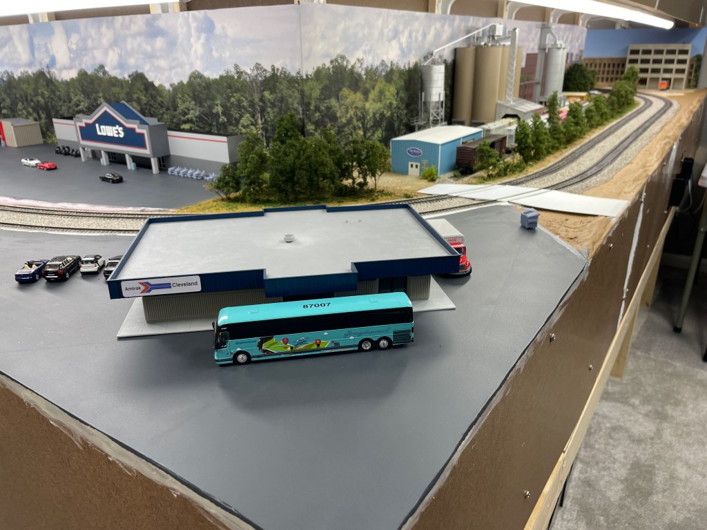 The next in the series is the Amtrak station. This was built from the Walthers Cornerstone kit that is a good representation of most Midwest facilities I’ve seen while riding on the long distance trains. It’s also a great way to relax and see the countryside, but that’s another story… 🙂