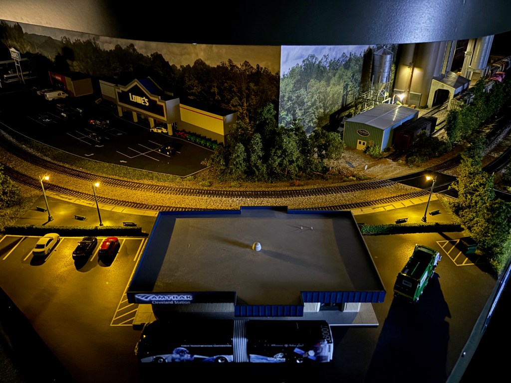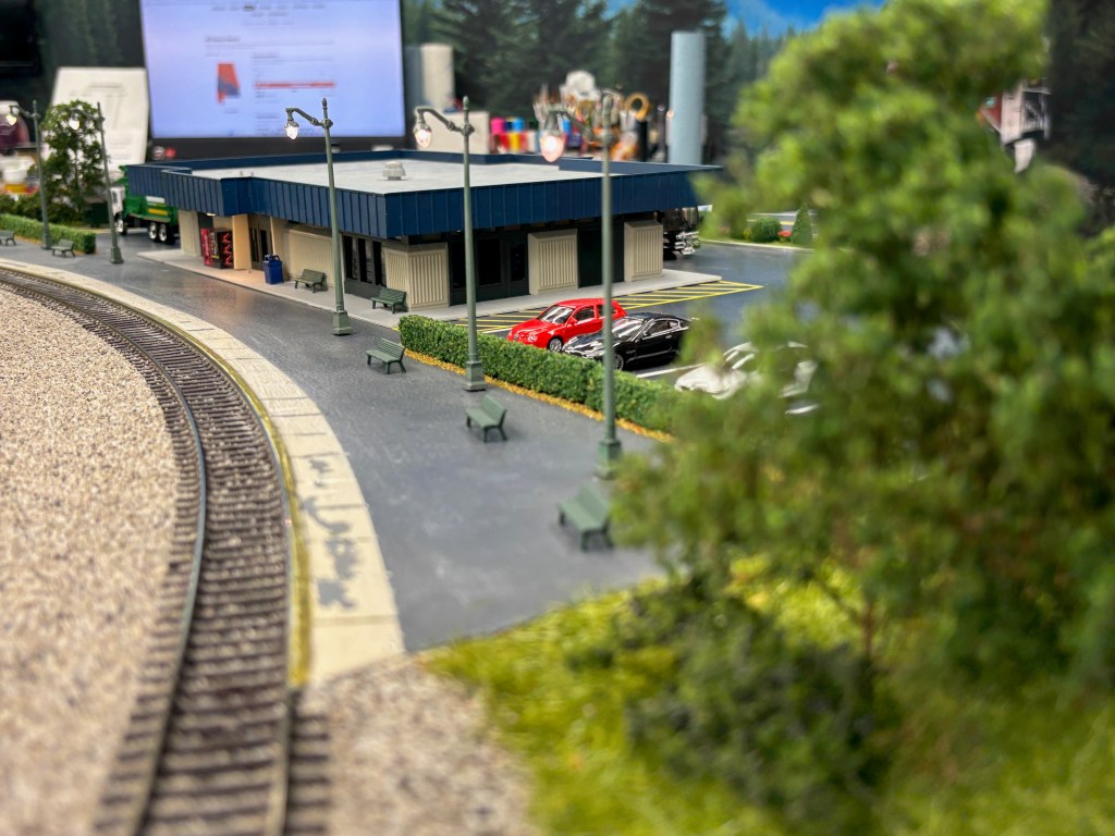 I started adding more super trees to each side of the parking lots and added the road divider landscaping, which also houses the stations main sign. Woodland Scenics lights were then added to the passenger platform.