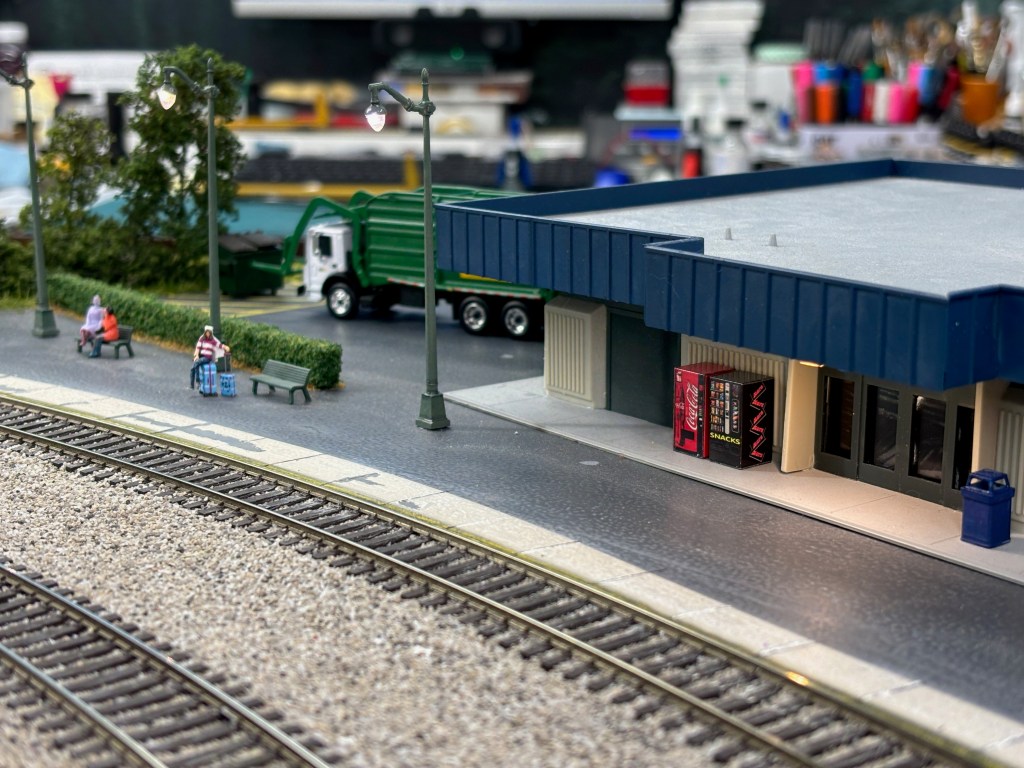 Next up, I added the concrete section with light cement colored paint and then added some rough patches along with the weathered yellow “do not cross” line. The vending machines by the station doors are from a small company located here in OH called Leavin’ A Mark.